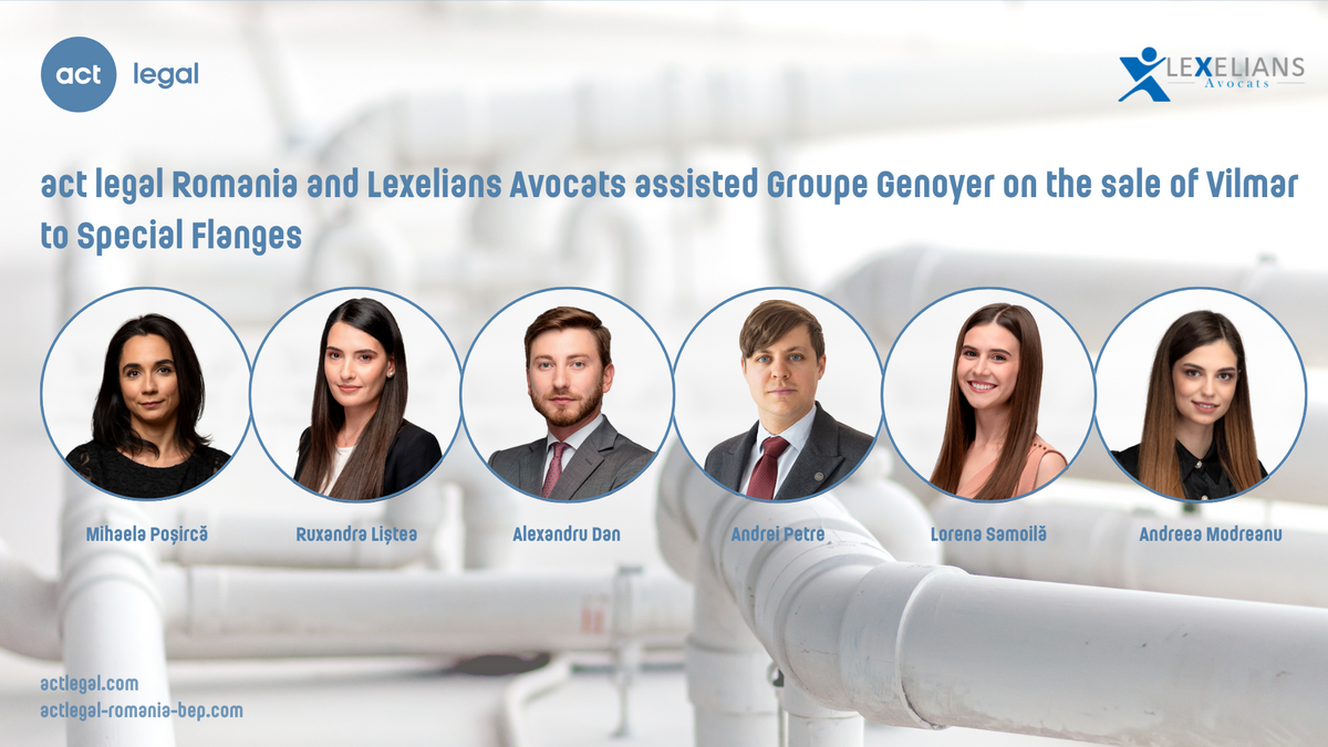 act legal Romania and Lexelians Avocats assisted Groupe Genoyer, a French-headquartered industrial group with a long-standing global footprint in the supply of piping components and engineered equipment, on the sale of its Romanian subsidiary Vilmar S.A. to Special Flanges, a portfolio company of Wise Equity SGR.