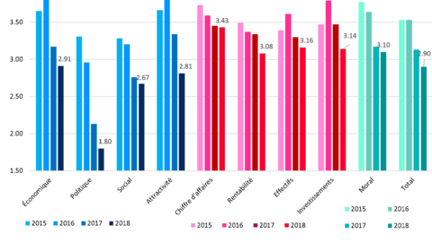 Le baromètre général, agrégeant tous les indicateurs, se situe à 2,9, en perte de 0,23 points par rapport à 2017 et 0,63 points par rapport à 2016.