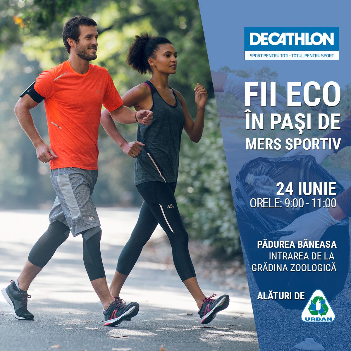 Decathlon et ses partenaires d’Urban vous invitent à participer à l'événement «Soyez ÉCO dans les promenades sportives» le 24 juin. L'événement aura lieu entre 09h00-11h00, le point de départ, respectivement l'arrivé sera l’entrée du Jardin Zoologique dans la Forêt de Baneasa.