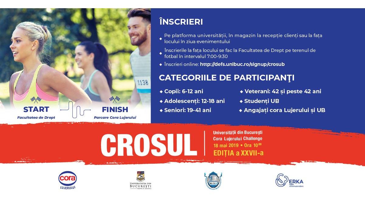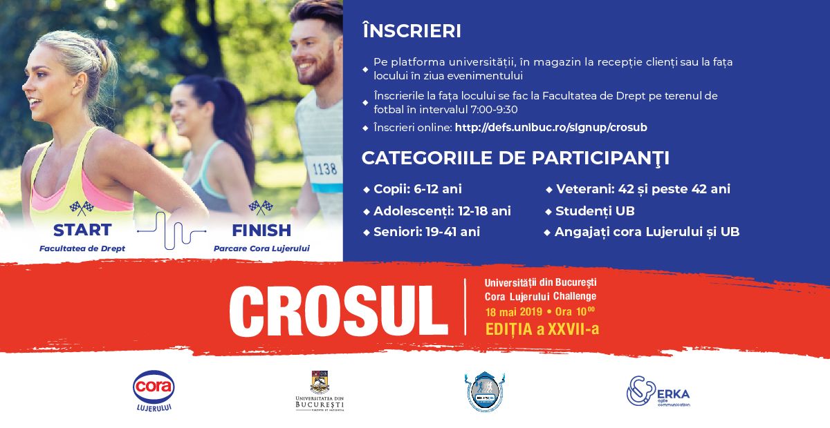 vie sain. Ce cross est destiné aux amateurs et aux sportifs de Bucarest. En collaboration avec l'hypermarché cora et l'Université de Bucarest, nous organisons cet événement depuis 2005 et nous sommes fiers d'annoncer que cette année nous fêtons sa 27ème édition, une édition que nous aimerions beaucoup si vous pouviez vous joindre à nous en tant que sponsors / partenaires. Nous attendons de nombreux participants (plus de 3 000) qui participeront à un événement sportif et grisant, un véritable promoteur de la santé et du bien-être.
