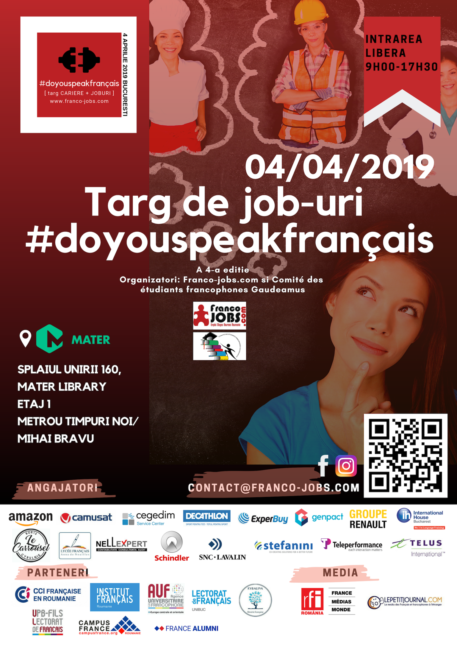 Baptisé « Do you speak français » car dédié particulièrement aux anglophones et francophones, le forum de l’emploi aura lieu le 4 avril 2019 à l’adresse Splaiul Unirii 160, salle Mater Library, 1er étage, un espace professionnel et calme adapté aux discussions et aux entretiens directs sur place.