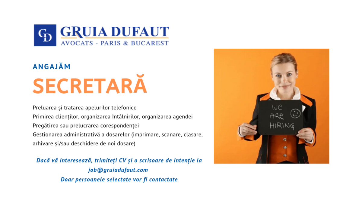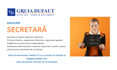 Cabinetul de avocatură GRUIA DUFAUT recrutează un/o secretar(ă). Postul este disponibil imediat pentru sediul din București situat în centrul orașului (Bd. Hristo Botev nr. 28, Sector 3)
