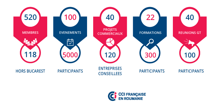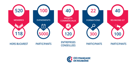 Au service de notre communauté, la CCIFER déploie trois missions: créer de nouvelles opportunités, soutenir le développement de nos membres à travers des services, et représenter la voix des entreprises dans le dialogue public. Cela s’est traduit par 100 évènements organisés à Bucarest et en province, 40 projets de développement commercial en Roumanie ou en France, 300 participants dans les formations proposées et plus de 100 participants impliqués dans les 10 groupes de travail actifs au sein de la CCIFER.