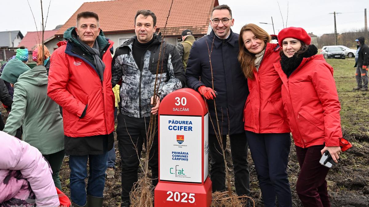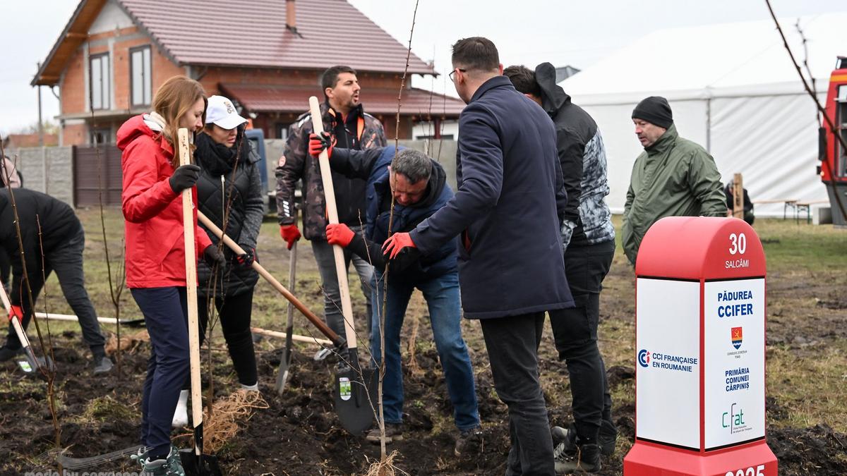 La Chambre de Commerce, d’Industrie et d’Agriculture Française en Roumanie (CCIFER), en partenariat avec le Conseil départemental de Timiș et la Mairie de Cărpiniș, a organisé les 21 et 22 novembre 2025 la première édition du projet « Plantons la Forêt CCIFER » dans le département de Timiș, à Cărpiniș : deux journées consacrées à l’éducation pour le développement durable à l’École secondaire de Cărpiniș et à l’engagement communautaire à travers une vaste action de reboisement.