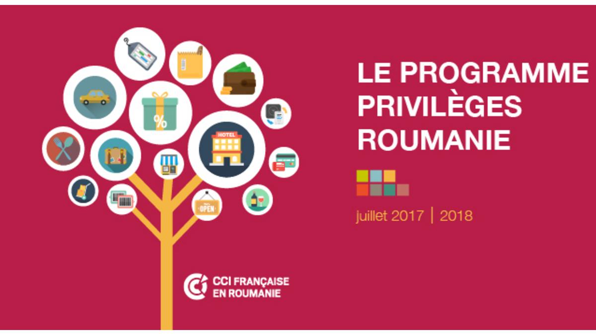 La Chambre de Commerce et d'Industrie Française en Roumanie (CCIFER) a le plaisir de vous annoncer le lancement de la nouvelle brochure Privilèges, qui réunit cette année, 50 offres de la part de sociétés membres de différents secteurs d'activité: gastronomie, tourisme, hotels, commerce, services (location voitures, traductions, assurances, juridique, fiscalité, recrutement, medical, formation, communication etc.)