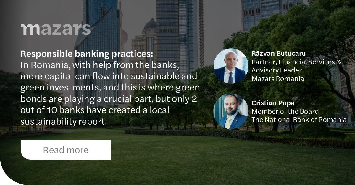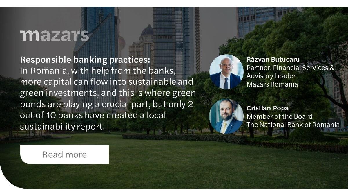 „The financial world can no longer see its future as separate from the environment and climate change developments. Despite the progress made in the last years by local banks, the full implementation of relevant practices to achieve the transition to a socially responsible and net zero economy remains an important challenge and more efforts are necessary going further.”, mentioned Răzvan Butucaru, Partner, Financial Services & Advisory Leader, Mazars Romania.
