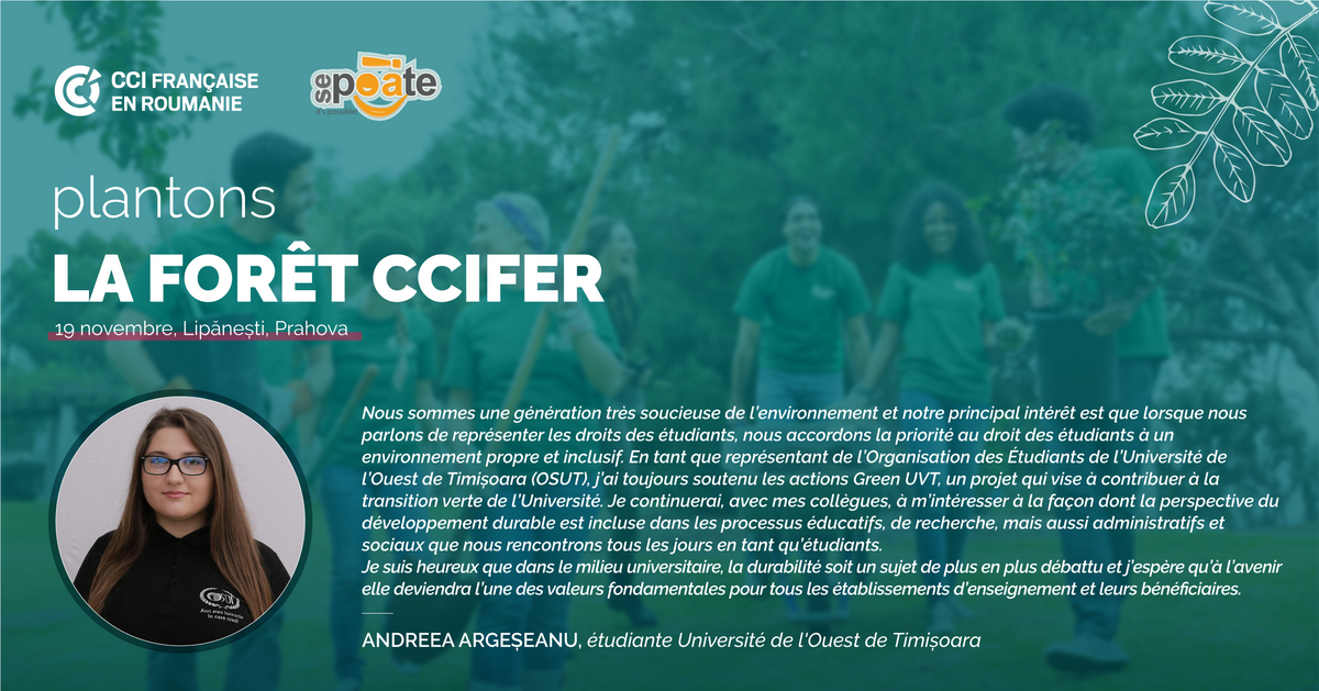 Nous sommes dans une course pour une Roumanie plus verte et plus respirante ! Le 09/11/2022 Découvrez de ceux qui soutiennent notre plantation ce que signifie la Forêt CCIFER. Voir en mode carousel Voir en mode mosaïque
