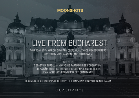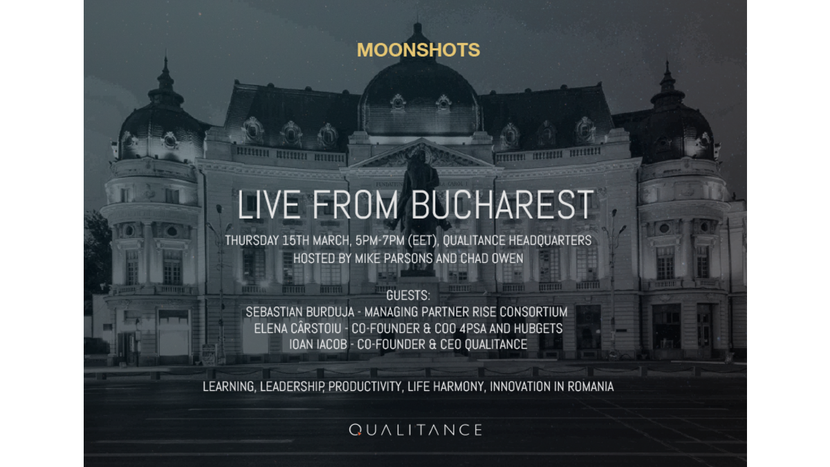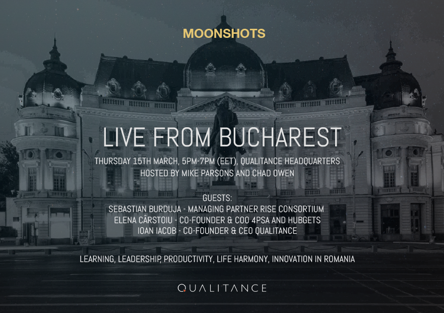 This time, Moonshots will go LIVE on Facebook from the QUALITANCE headquarters. The MOONSHOTS PODCAST LIVE FROM BUCHAREST will take the form of a relaxed and engaging talk show covering topics such as leadership, learning, productivity, life harmony and innovation.