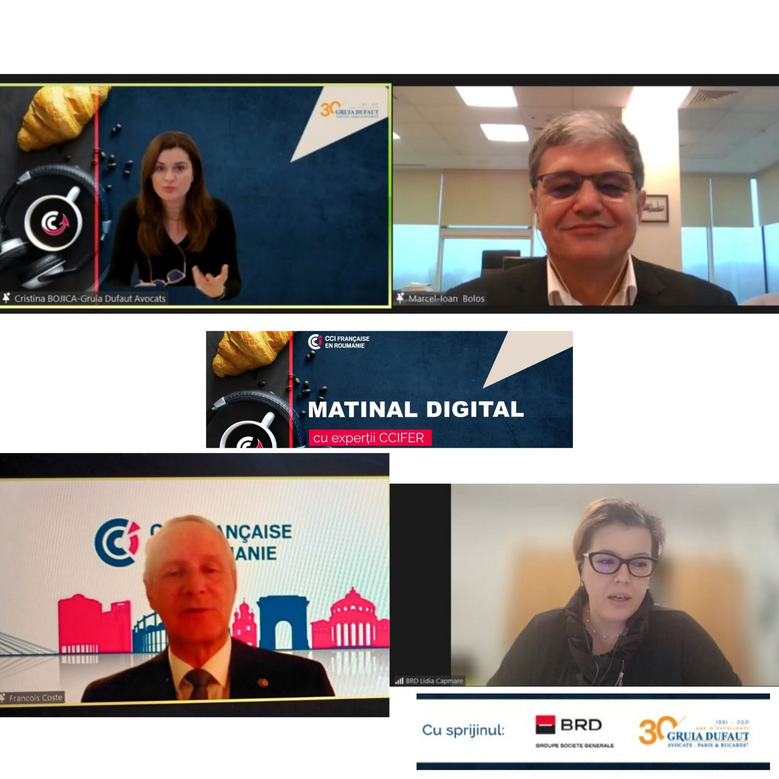 CCIFER, en partenariat avec BRD – Groupe Société Générale et Gruia Dufaut Cabinet d’Avocats, a organisé le 6 décembre 2022, une édition du « Matinal Digital», consacrée à une discussion sur le bilan PNRR pour 2022, les priorités pour 2023, et les opportunités de financements des Programmes Opérationnels 2021-2027, pour le milieu d’affaires.
