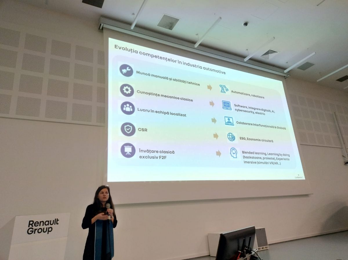 Roxana Simion, Directrice des Ressources Humaines de Renault Group Roumanie, a présenté l’évolution de l’entreprise et les changements significatifs dans l’industrie automobile, en pleine transition accélérée vers l’électrification, la digitalisation et l’automatisation.