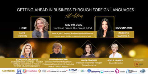 A_BEST, one of the largest independent centers for the study of foreign languages in Romania, is organizing the conference titled “Getting Ahead in Business through Foreign Languages”, 7th Edition in collaboration with prestigious business representatives. The conference is going to be held on the 5th of May 2022, at 18.00, at Noblesse Palace in Bucharest and its target audience is represented by HR professionals who work in multinational companies, managers, as well as entrepreneurs.