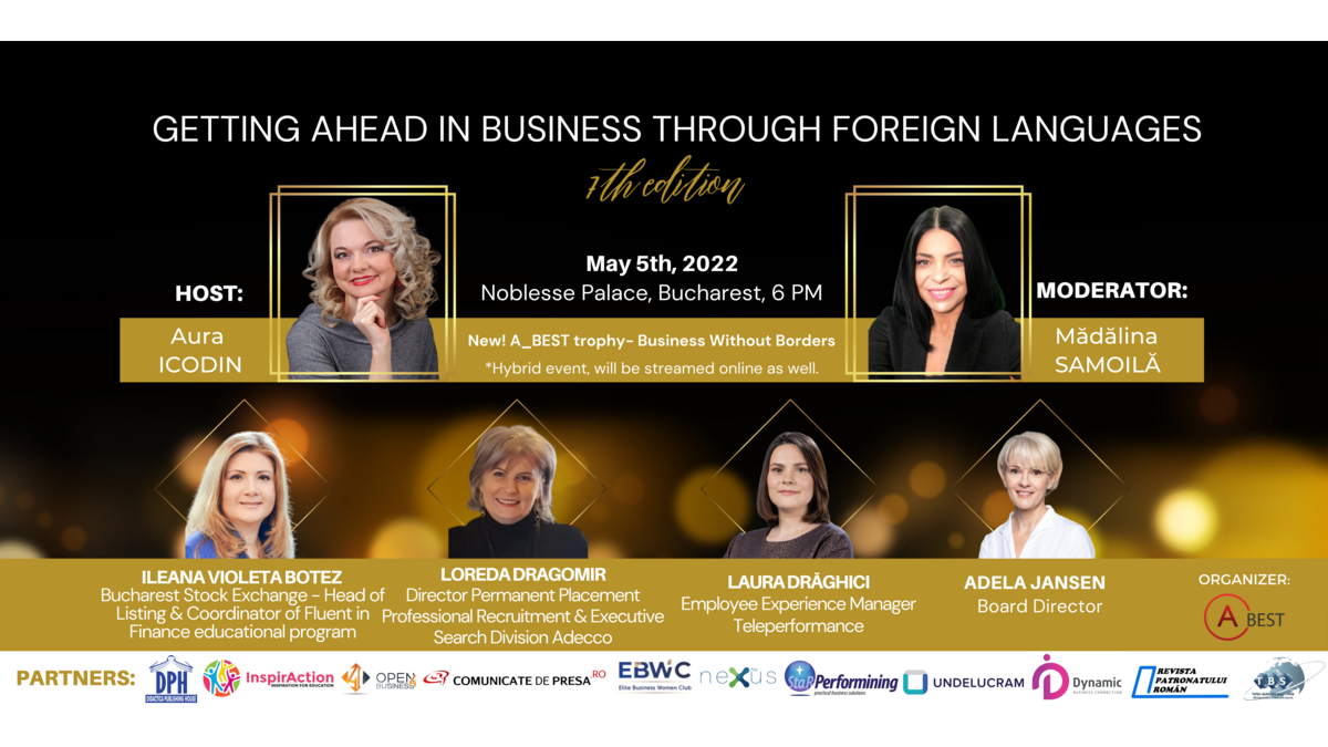 A_BEST, one of the largest independent centers for the study of foreign languages in Romania, is organizing the conference titled “Getting Ahead in Business through Foreign Languages”, 7th Edition in collaboration with prestigious business representatives. The conference is going to be held on the 5th of May 2022, at 18.00, at Noblesse Palace in Bucharest and its target audience is represented by HR professionals who work in multinational companies, managers, as well as entrepreneurs.
