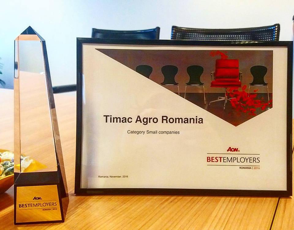 Selon l'enquête Aon Roumanie, Timac Agro Roumanie a été désigné meilleur employeur de Roumanie dans la catégorie des petites entreprises. 37 entreprises ont participé cette année à l'enquête menée par Aon Roumanie, ce qui représente 13 400 employés et 250 cadres supérieurs dans divers domaines.