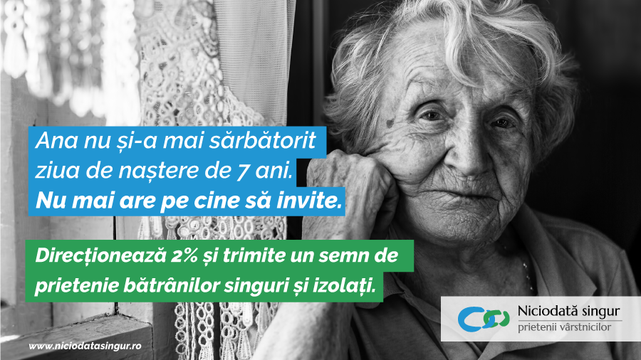 Les fonds récoltés dans le cadre de la campagne 2% nous aident à développer les programmes de l’Association Niciodată Singur – Prietenii Vârstnicilor et à aider plusieurs personnes âgées confrontées à la pauvreté, à l'isolement et à la maladie. Avec l'aide des volontaires, nous continuerons à rendre visite au domicile des personnes âgées, à effectuer des activités dans les maisons de retraite et à fournir un soutien matériel et financier aux personnes dans le besoin.