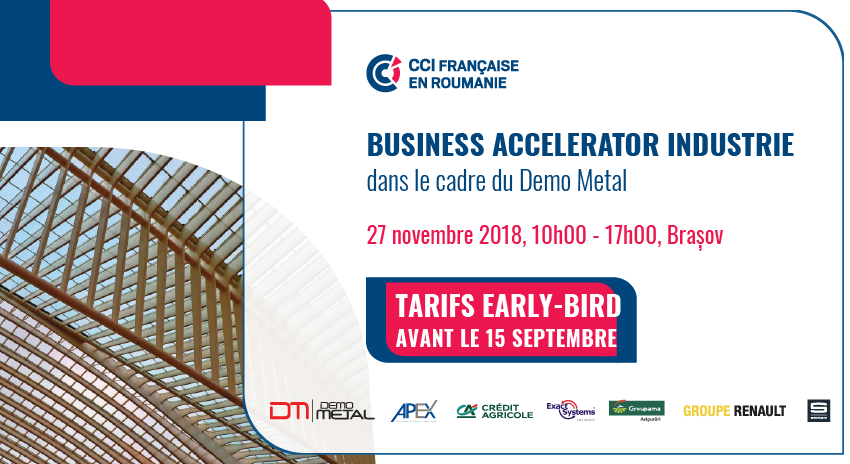 La Chambre Française de Commerce et d’Industrie en Roumanie (CCIFER) a le plaisir de vous inviter au Forum d’affaires Business Accelerator Industrie, qui aura lieu le 27 novembre 2018, entre 10h00-17h00, à Brasov, dans le cadre de la foire Demo Metal.