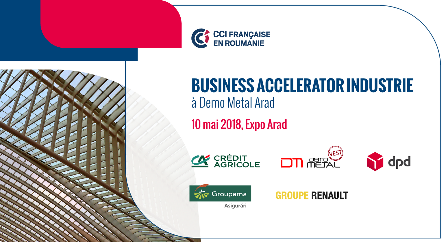 La Chambre Française de Commerce et d’Industrie en Roumanie (CCIFER) a le plaisir de vous inviter au Forum d’affaires Business Accelerator Industrie, organisé le 10 mai 2018, à Arad, dans le cadre de Demo Metal Vest (adresse: Expo Arad, Str. Calea Aurel Vlaicu, nr. 300).