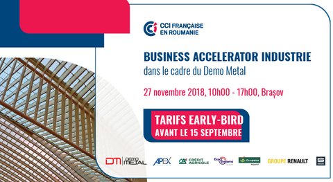La Chambre Française de Commerce et d’Industrie en Roumanie (CCIFER) a le plaisir de vous inviter au Forum d’affaires Business Accelerator Industrie, qui aura lieu le 27 novembre 2018, entre 10h00-17h00, à Brasov, dans le cadre de la foire Demo Metal.