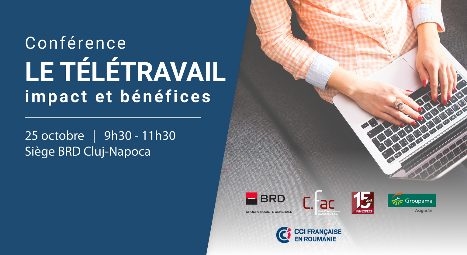 La Chambre Française de Commerce et d’Industrie en Roumanie (CCIFER) et le Club Francophone d'Affaires de Cluj (CFAC), ont le plaisir d'inviter les directeurs généraux et les directeurs ressources humaines des sociétés de Cluj-Napoca, à apprendre plus de détails sur l'avenir du télé-salarié, dans le cadre de la Conférence "Le téletravail - impact et bénéfices à Cluj-Napoca, qui aura lieu le 25 octobre, à partir de 9h30 (9h00-9h30: welcome coffee), au siège de la BRD Groupe Société Générale Cluj -Napoca (adresse: Bulevardul 21 Decembrie 1989, nr.81-83, etaj 10, Cluj-Napoca).