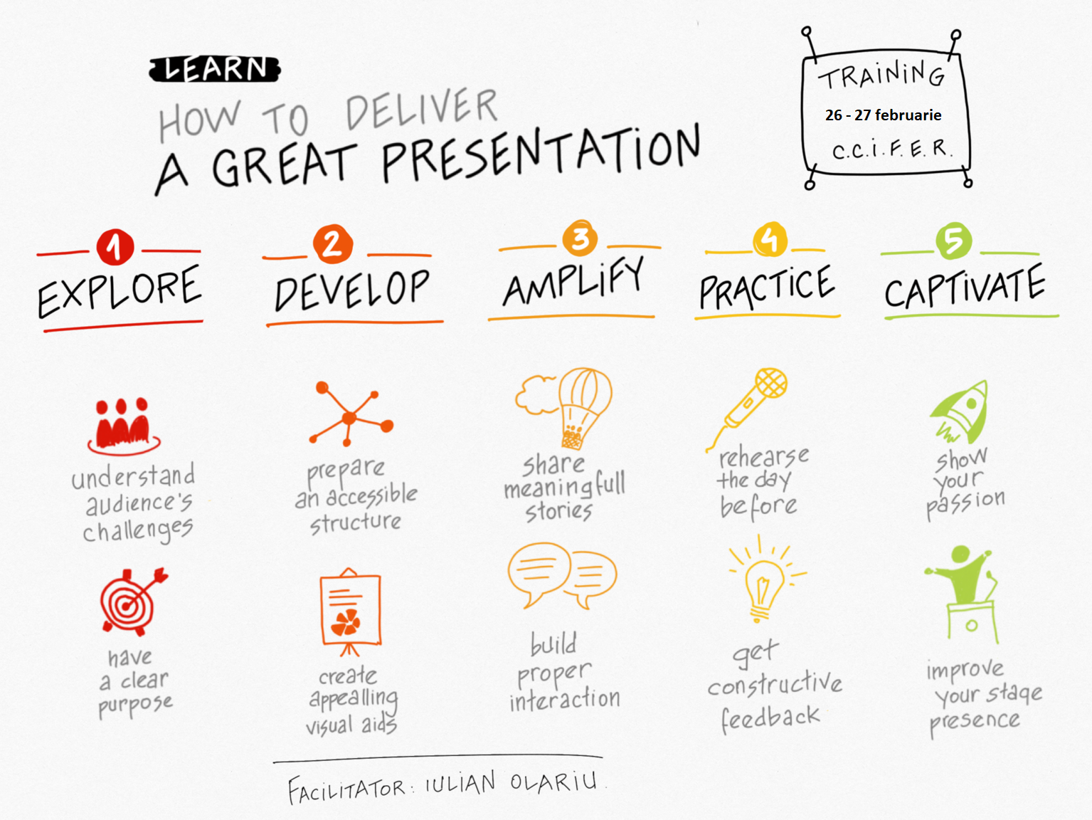 Notre formateur : Iulian Olariu a une expérience de plus de 15 ans dans le domaine des présentations publiques pour une variété d’audiences. Les nombreux thèmes et sujets qu’il a abordés jusqu'au présent, ainsi qu'une approche interactive, recommandent Iulian comme formateur avisé pour ce type de cours.