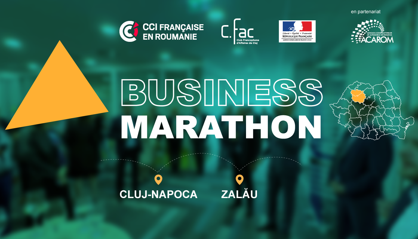 La CCIFER, le Club Francophone d'Affaires de Cluj et l’Agence Consulaire de France à Cluj, en partenariat avec l'ACAROM, ont le plaisir de vous inviter au Business Marathon qui aura lieu entre le 10 et le 11 octobre 2023 à Cluj-Napoca et à Zalău.