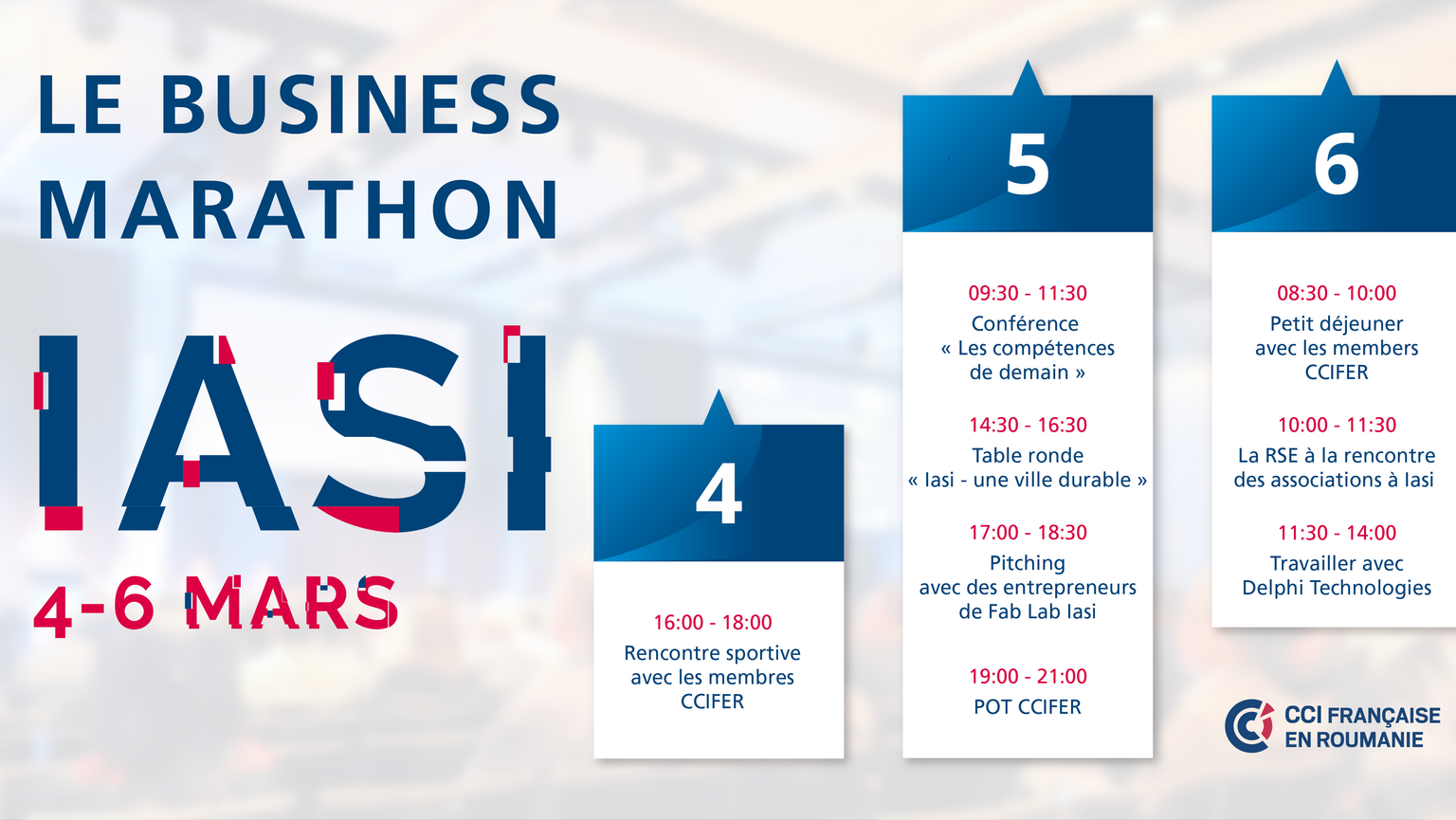 Nous vous invitons au Marathon de business pour connaitre la communauté d’affaires de Iasi autour de plusieurs événements organisés en présence de Francois Coste, Président de la CCIFER, de Radu Gradinaru, Consul honoraire de France à Iasi, des partenaires institutionnels, des représentants des sociétés membres et partenaires.