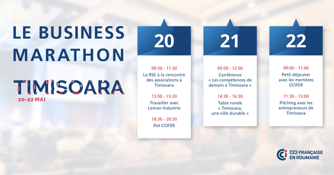A côté du Centre d’Affaires Franco-Roumain de Timisoara, des partenaires institutionnels et stratégiques, la CCIFER vous invite à Timisoara entre le 20 – 22 mai pour participer aux suivants événements :
