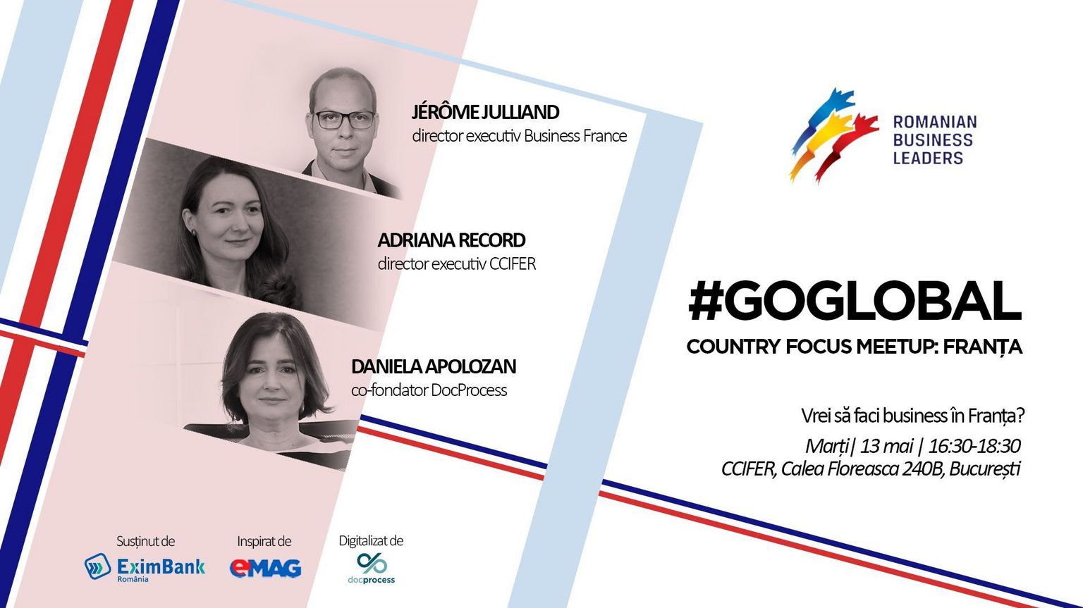 Fundația Romanian Business Leaders organizează luni, 13 mai, orele 16.30-18.30, un Meetup despre internaționalizare, alături de CCIFER, în care va fi prezentată Franța, ca destinație de investiții și dezvoltare pentru antreprenorii români. Viziunea RBL este că avem nevoie de mai multe companii românești peste hotare și așa a luat naștere proiectul Start-Up Bridge, prin care sunt sprijinite firmele în vederea internaționalizării.
