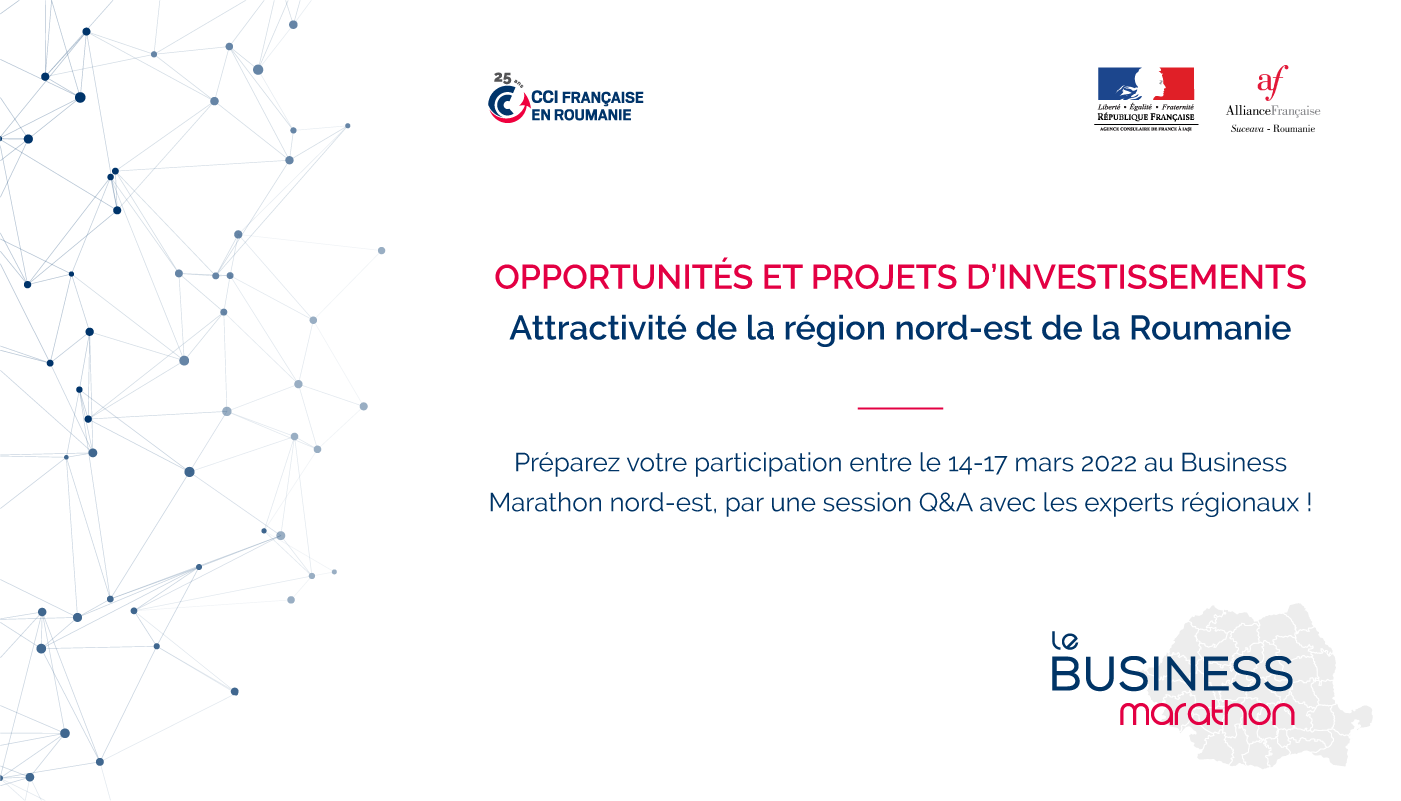 La CCIFER, avec le soutien de l’Agence Consulaire de France à Iași et de l’Alliance Française de Suceava ont le plaisir de vous inviter à une incursion digitale dans la région nord-est de la Roumanie pour découvrir des opportunités d’investissements, de financements et de développement des projets sectoriels.