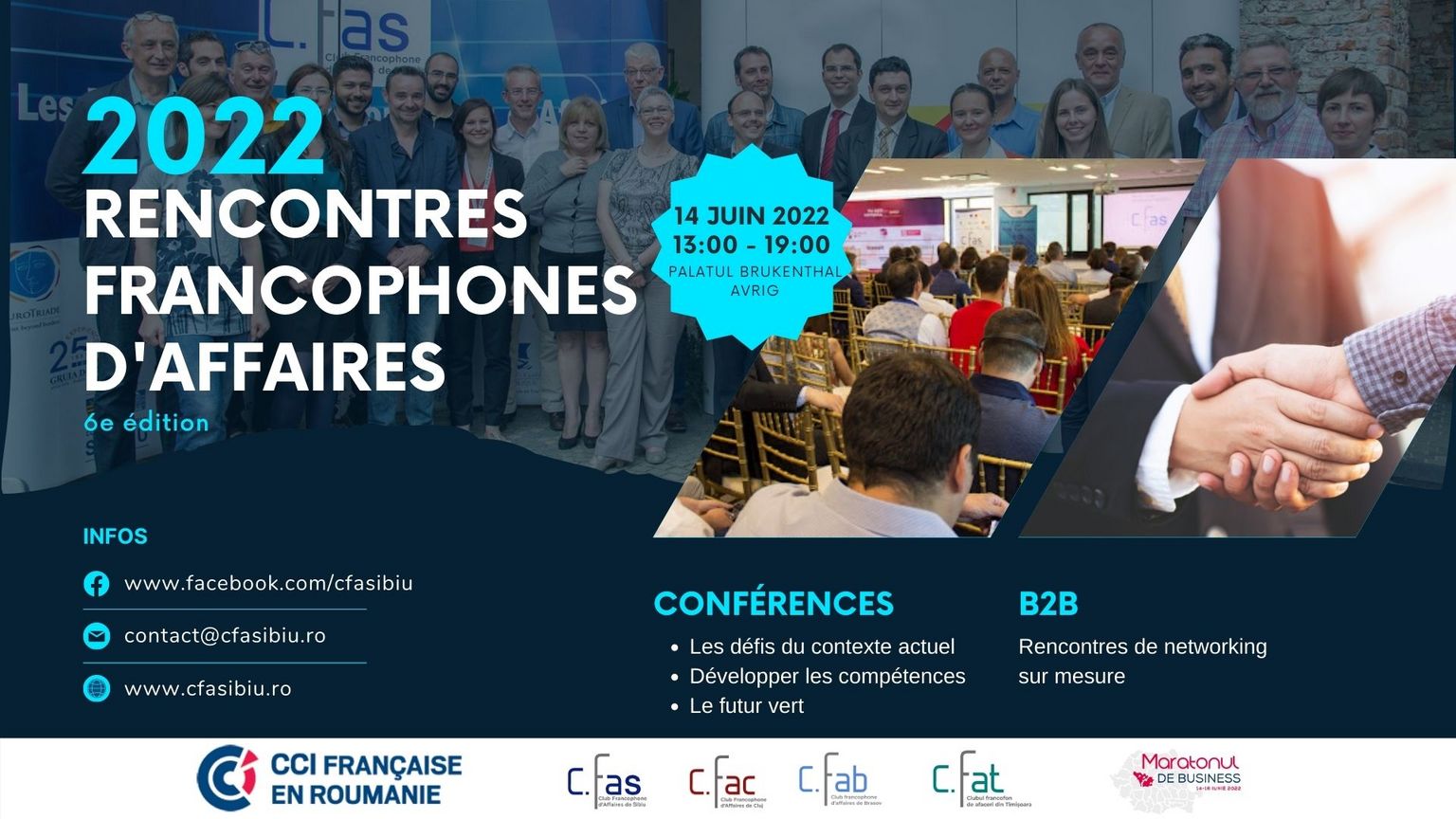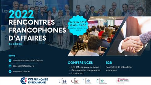 Le Club Francophone d’Affaires de Sibiu (CFAS) a le plaisir de vous inviter a participer à la 6e édition des Rencontres Francophones d’Affaires (RFA), qui aura lieu le 14 juin 2022, au Palais Brukenthal à Avrig.