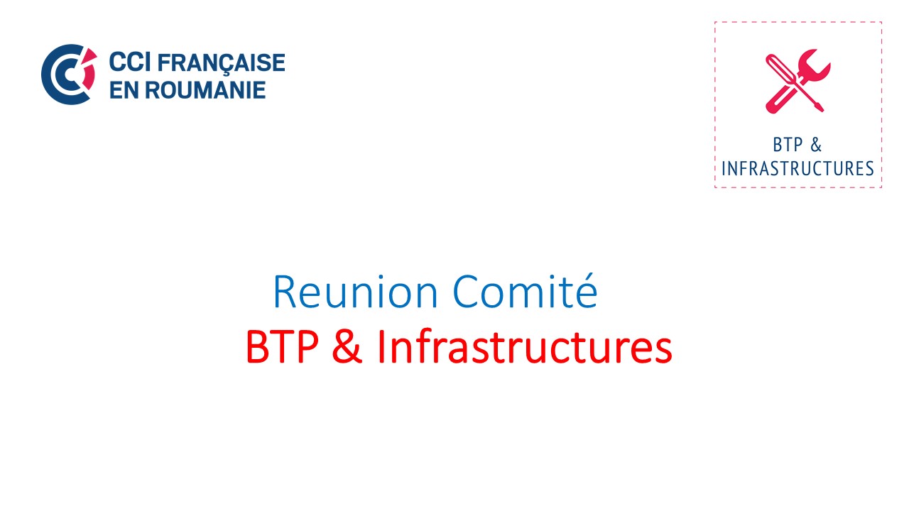 La CCI Française en Roumanie a le plaisir de vous inviter participer en ligne à la réunion du Comité BTP & Infrastructures le 25 mars pour échanger sur la situation de votre secteur, les menaces de la période qui suit et les bonnes pratiques que vous pouvez partager pour faire face à cette situation de crise.
