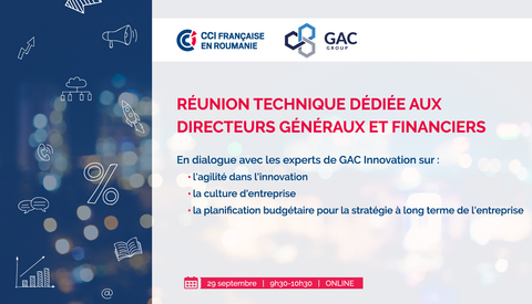La CCIFER a le plaisir d'inviter les directeurs généraux et les responsables financiers et économiques à une réunion technique pour discuter avec les experts internationaux de GAC Innovation sur l'agilité dans l'innovation, la culture d'entreprise et la planification budgétaire pour la stratégie à long terme de l'entreprise.