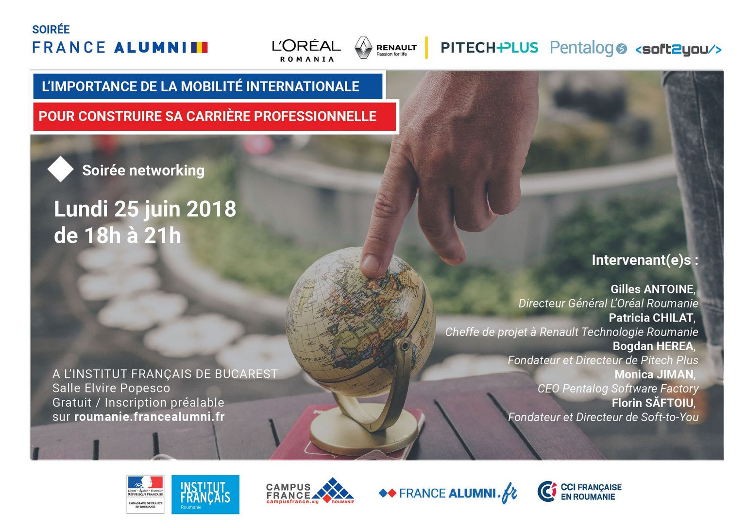 Le 25 juin 2018, l'Institut français de Roumanie organise une grande soirée France Alumni sur le thème de l'importance de la mobilité internationale pour construire sa carrière professionnelle.