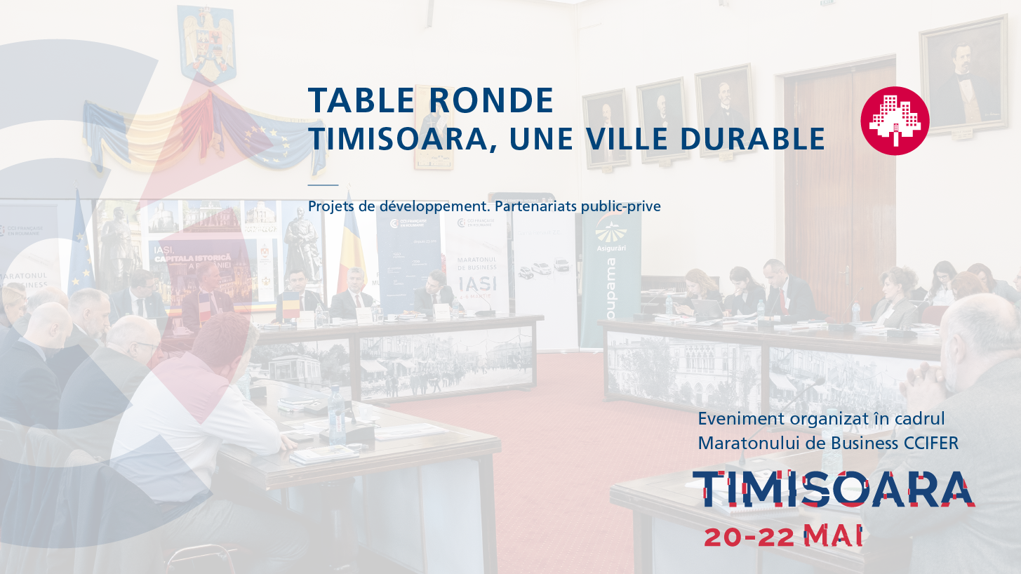 La CCIFER et le Centre d'Affaires Franco-Roumain de Timisoara vous invitent à une table ronde, organisée en présence du maire de la ville de Timisoara, Nicolae ROBU, afin de débattre ensemble les projets de développement de la ville de Timisoara et de l'Alliance de Ouest, et voir comment les acteurs privés et les sociétés membres de la CCIFER peuvent s'impliquer dans cette démarche.