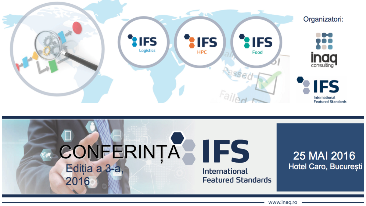 INAQ Consulting, companie membra CCIFER va invita la cea de a 3-a ediție a Conferinței IFS, dedicată ultimelor noutăți în domeniul calității. Conferința va pune accentul pe importanța aspectelor legate de analiza produselor alimentare și nealimentare din perspectiva IFS și pe influența analizelor de materii prime și de produs finit pentru asigurarea calității și siguranței alimentului.