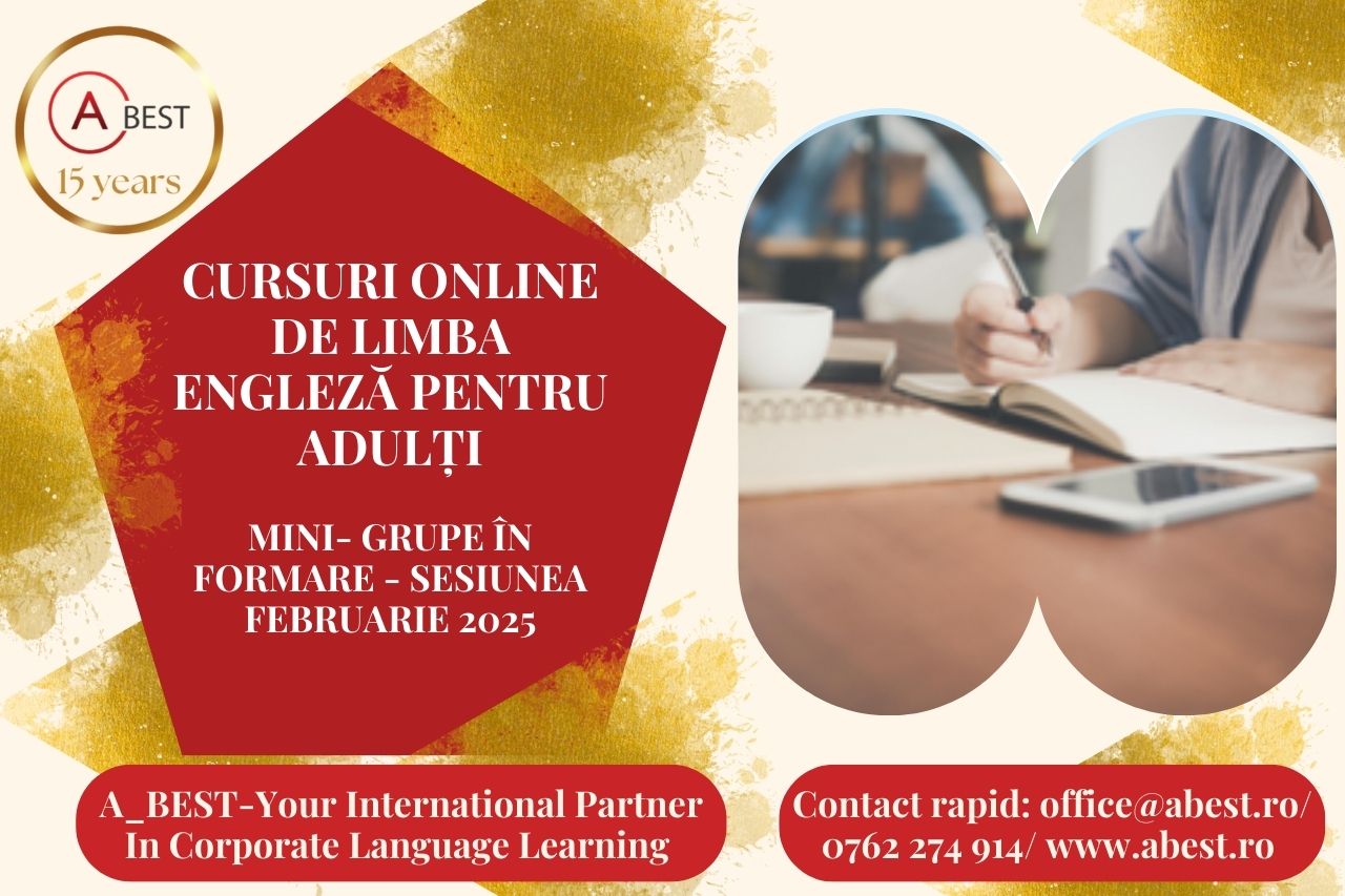 - cursuri A_BEST deschise, online, pe Zoom, cu trainer dedicat, de limba engleză, în sistem grupă: https://abest.ro/ro/cursuri-de-limba-engleza/