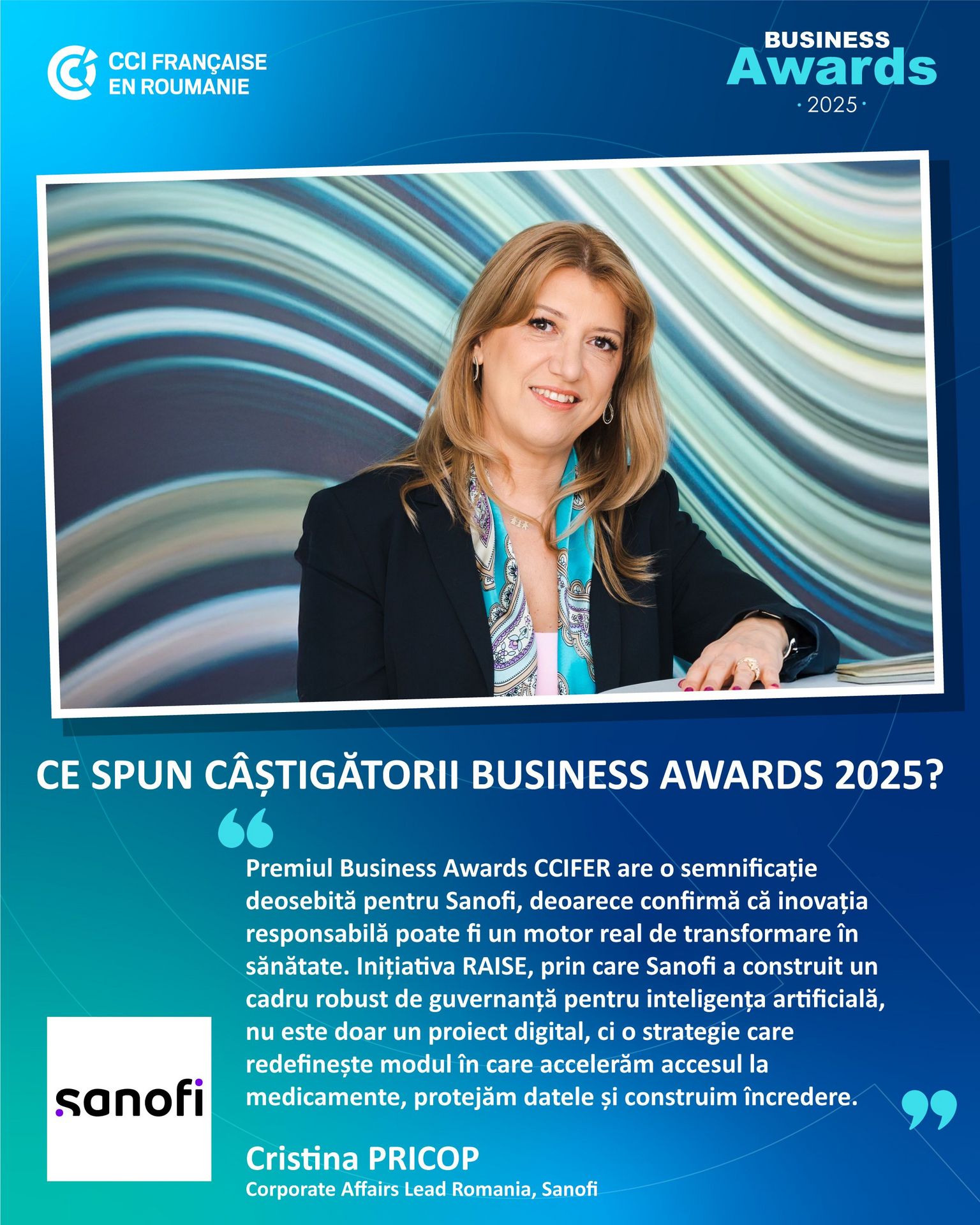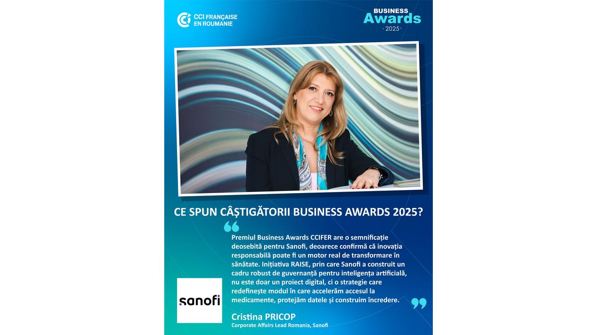 Premiul Business Awards CCIFER are o semnificație deosebită pentru Sanofi, deoarece confirmă că inovația responsabilă poate fi un motor real de transformare în sănătate. Inițiativa RAISE, prin care Sanofi a construit un cadru robust de guvernanță pentru inteligența artificială, nu este doar un proiect digital, ci o strategie care redefinește modul în care accelerăm accesul la medicamente, protejăm datele și construim încredere. Recunoașterea CCIFER demonstrează că abordarea noastră – bazată pe etică, transparență și sustenabilitate – este relevantă nu doar pentru industrie, ci și pentru societate. Impactul este concret: reducerea timpului de dezvoltare a noilor molecule, îmbunătățirea rezultatelor din studiile clinice, optimizarea costurilor, creșterea eficienței și integrarea principiilor eco-responsabile în procesele digitale. În plus, RAISE a generat o schimbare culturală profundă în companie: angajații au fost instruiți în AI responsabilă, colaborarea între echipe s-a intensificat, iar tehnologia a devenit o responsabilitate colectivă, nu doar un domeniu al experților. Acest premiu ne poziționează ca lider în responsabilitatea digitală și ne oferă validarea că putem combina performanța economică cu respectul pentru oameni și mediu. Este o recunoaștere care ne inspiră să continuăm să inovăm pe principii solide, demonstrând că tehnologia poate fi un aliat al sănătății și al încrederii.