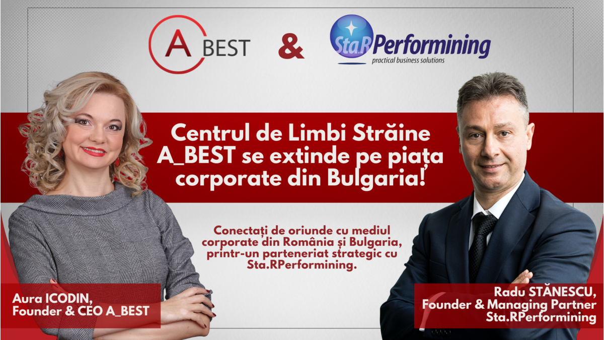 La aniversarea a 13 ani pe piața de profil, A_BEST (http://www.abest.ro/), unul dintre cele mai mari centre independente de învățare a limbilor străine din România, anunță recentul parteneriat cu compania de training și consultanță Sta.RPerformining, prin intermediul căreia va extinde cursurile sale de limbi străine corporate pe piața din Bulgaria. Astfel, echipa de traineri A_BEST va facilita conectarea diverselor medii corporate, prin servicii de training lingvistic remote de calitate, dedicate companiilor care activează pe piețe străine și pentru care comunicarea eficientă și rapidă cu partenerii de afaceri este vitală.