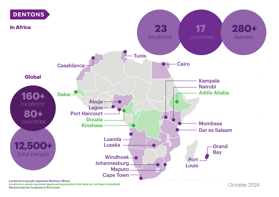 Dentons își extinde prezența în Africa prin asocierea cu Kouengoua Minou Nkongho (KMN) în Camerun, Pathy Liongo & Associates în Republica Democrată Congo, Tamrat Assefa Liban Law Office în Etiopia și LEGALIX în Senegal. Aceste firme dispun de o expertiză solidă pe piața locală, susținută de o experiență relevantă în sectorul energetic, al exploatării resurselor minerale și cel financiar-bancar, oferind, în același timp, consultanță în tranzacțiile corporative.