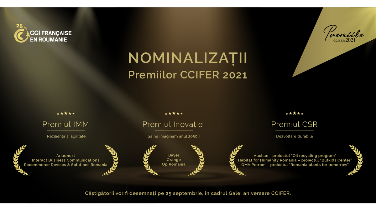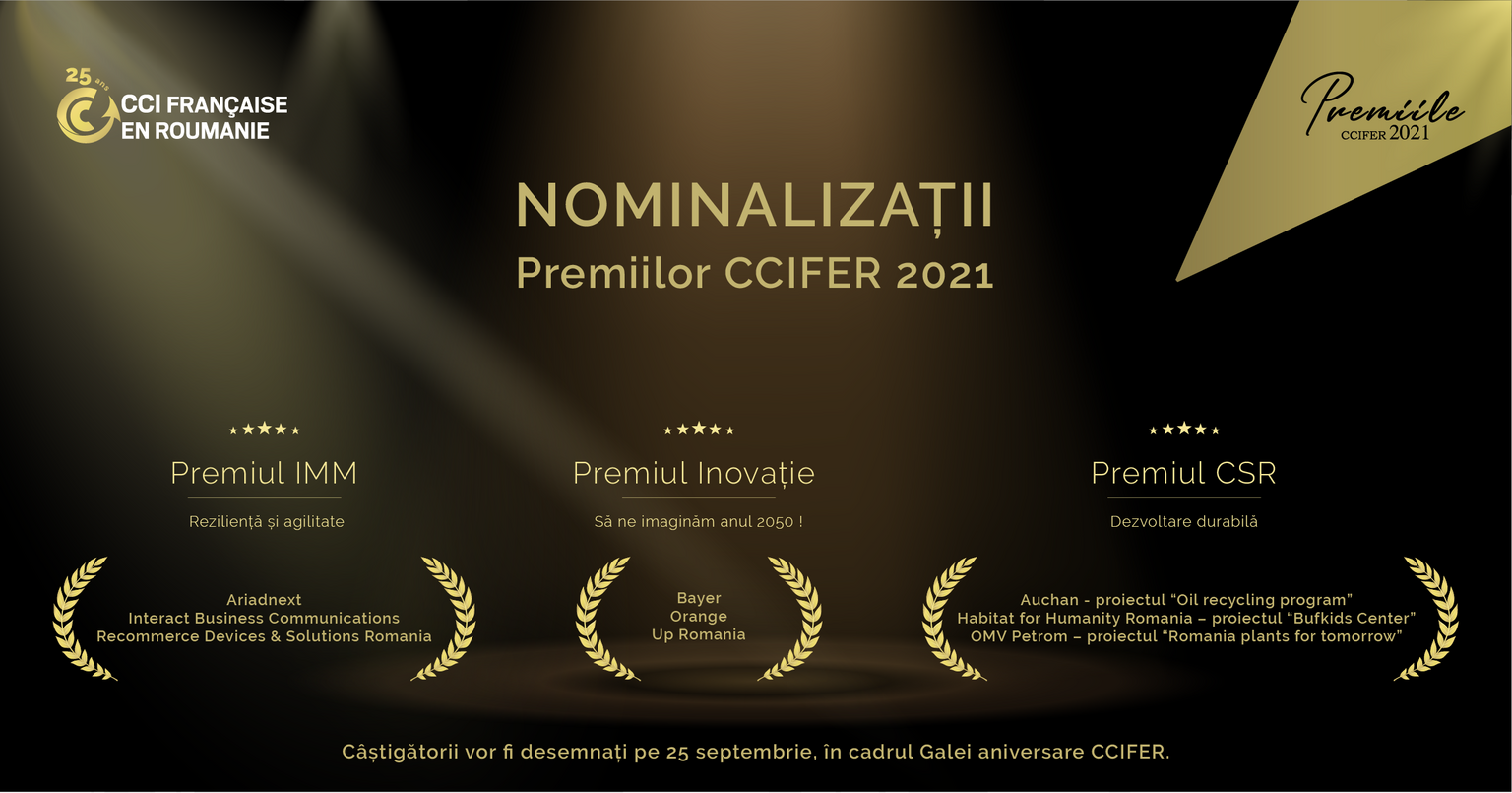 Pe 25 septembrie, în cadrul Galei aniversare organizare la Ateneul Român de Camera de Comerț, Industrie și Agricultură Franceză în România, vor fi decernate Premiile CCIFER 2021, ajunse la cea de-a 15-a ediție. Anul acesta, în cadrul celor 3 categorii ale concursului, IMM – reziliență și agilitate, Inovație și CSR – dezvoltare durabilă, s-au înscris în total 43 de proiecte.