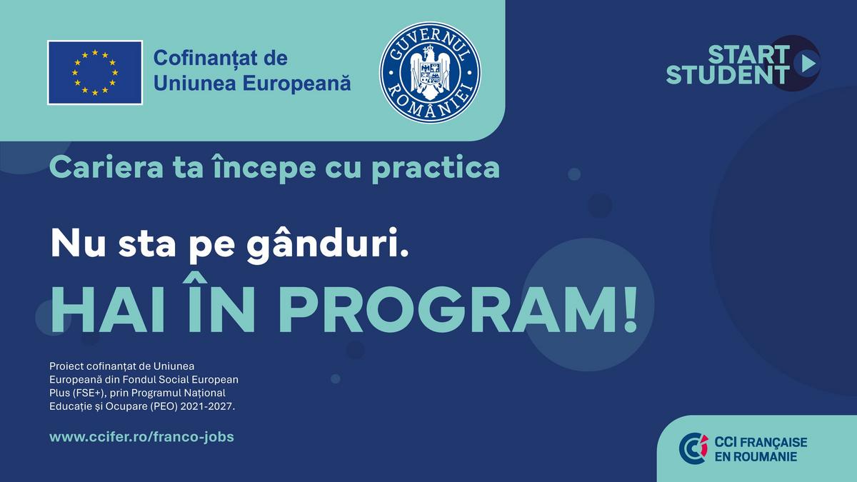 Proiectul „START STUDENT – Cariera ta începe cu practica” (cod SMIS 311871) este finanțat în cadrul Obiectivului de Politică 4: „Europa mai socială și mai favorabilă incluziunii, prin implementarea Pilonului european al drepturilor sociale”, Prioritatea P07: „Creșterea calității ofertei de educație și formare profesională”, obiectivul specific ESO4.5.
