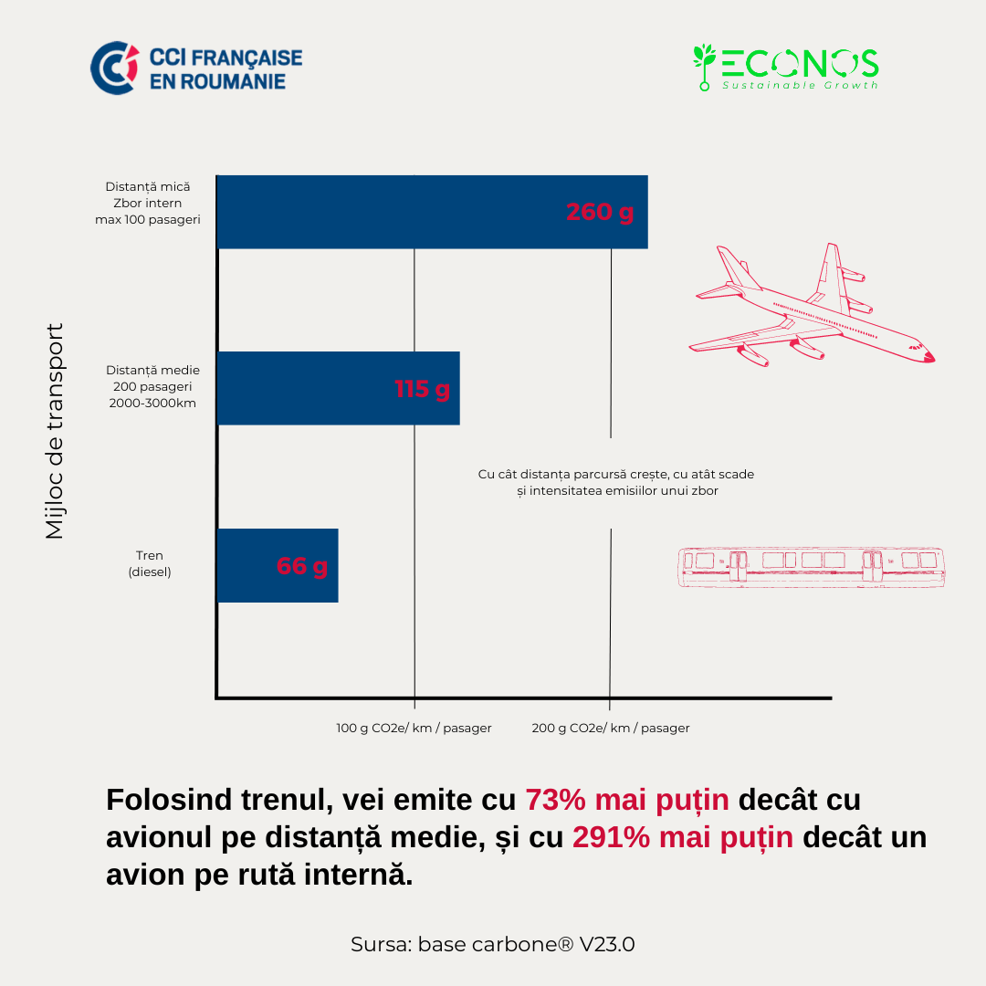 Când ne gândim la deplasările pe distanțe mici, cum ar fi cele interne, trenul se impune ca o opțiune ecologică, având un impact redus asupra emisiilor de CO2, în comparație cu avionul. Unul dintre motivele principale pentru care transportul cu trenul este mai prietenos cu mediul în ceea ce privește emisiile de CO2 se datorează consumului redus de combustibil, adică mai puțină energie pe pasager față de consumul masiv de combustibil al avioanelor.