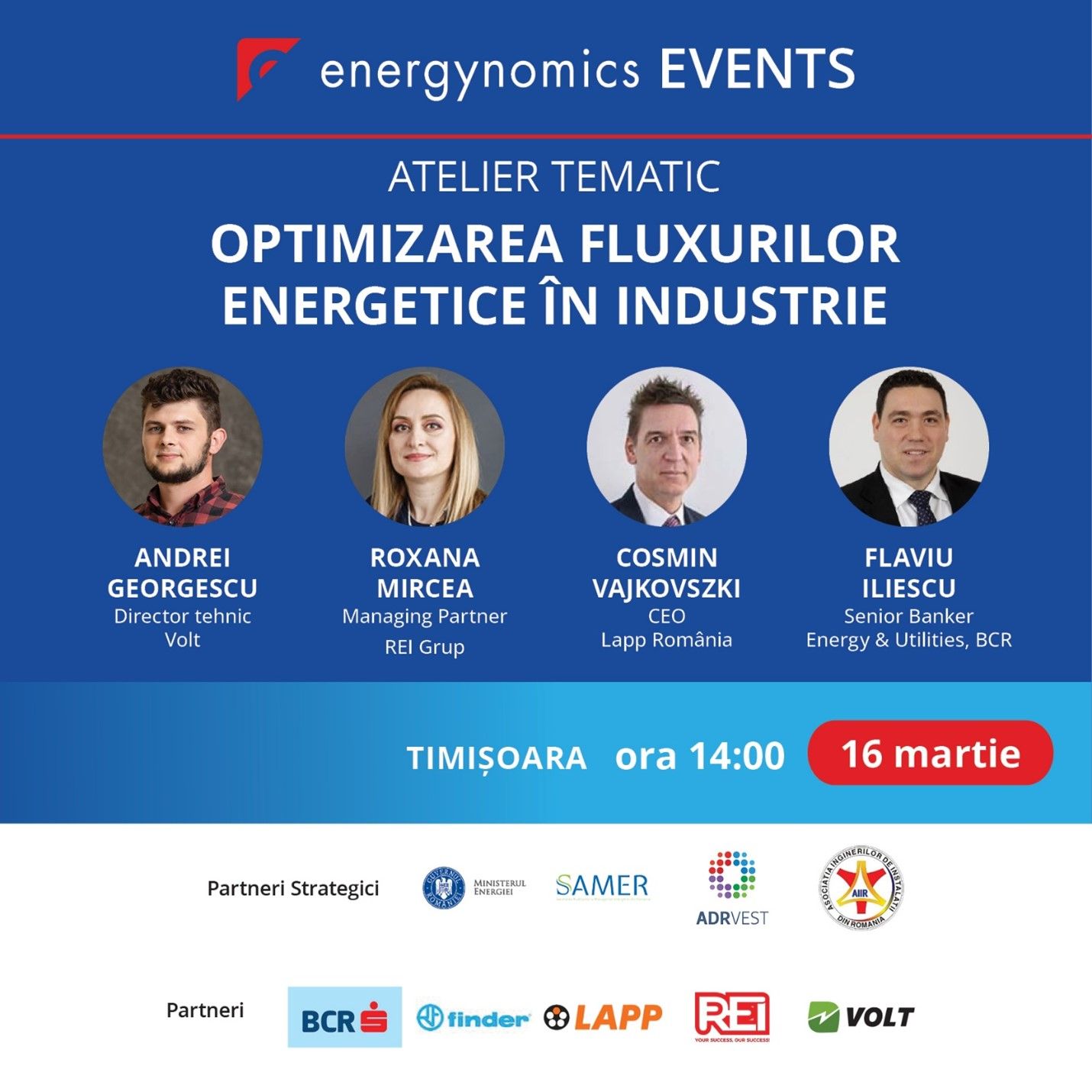 Pe 16 martie, la Hotel Timișoara (Str. Mărășești nr. 1-3), Energynomics va organiza de la ora 14:00, in continuarea conferintei "Digitalizare si eficienta energetica", un AtelierTematic, în care să discutăm soluții de optimizare a fluxurilor energetice la nivelul companiilor industriale din regiune.