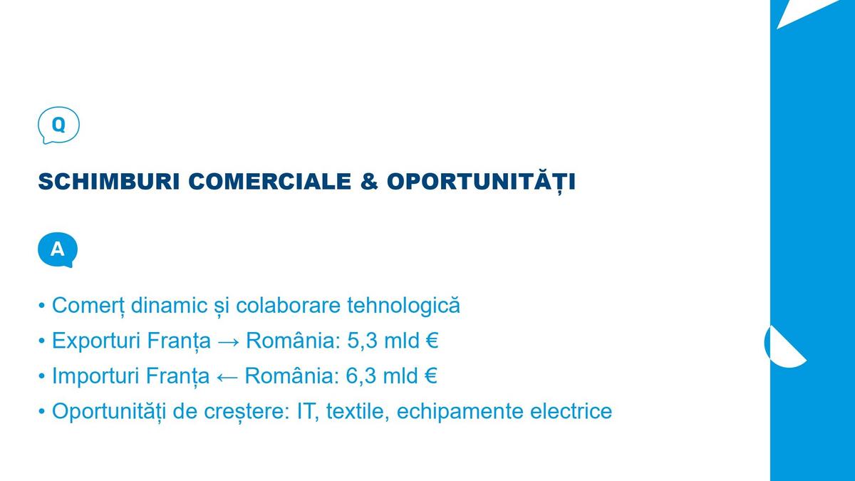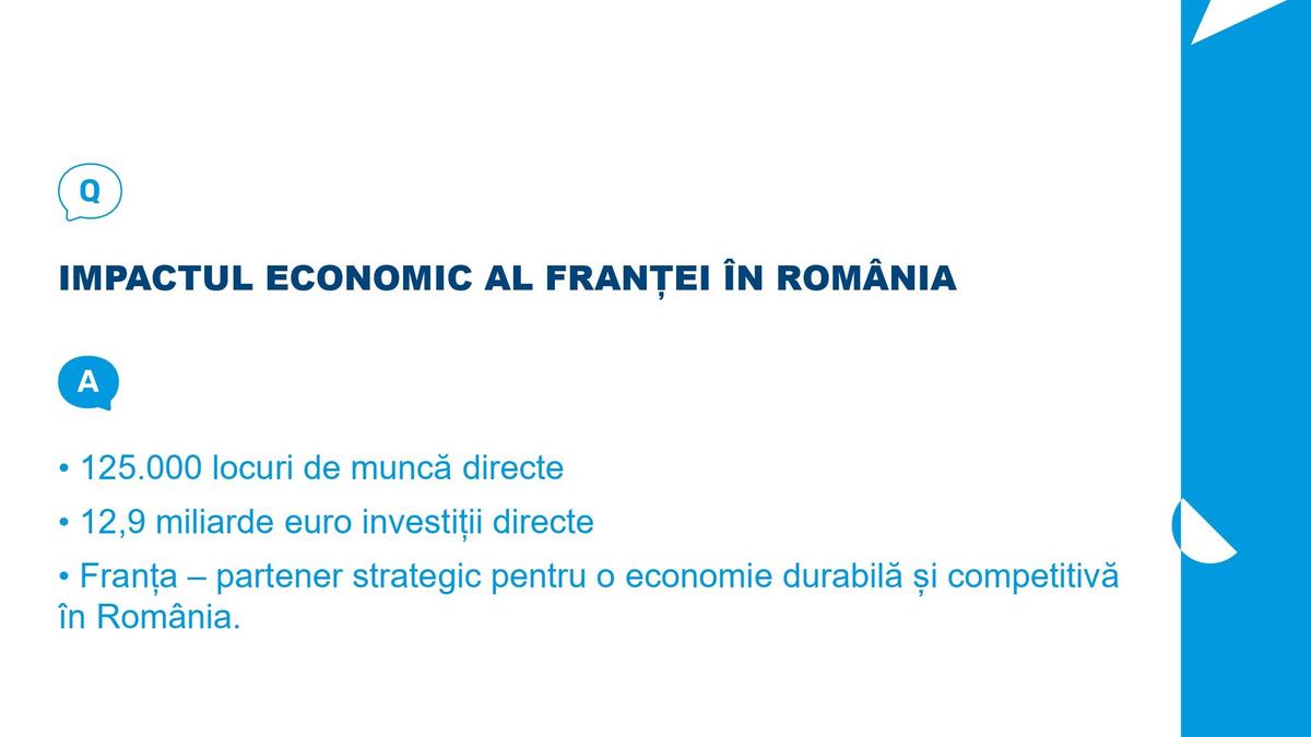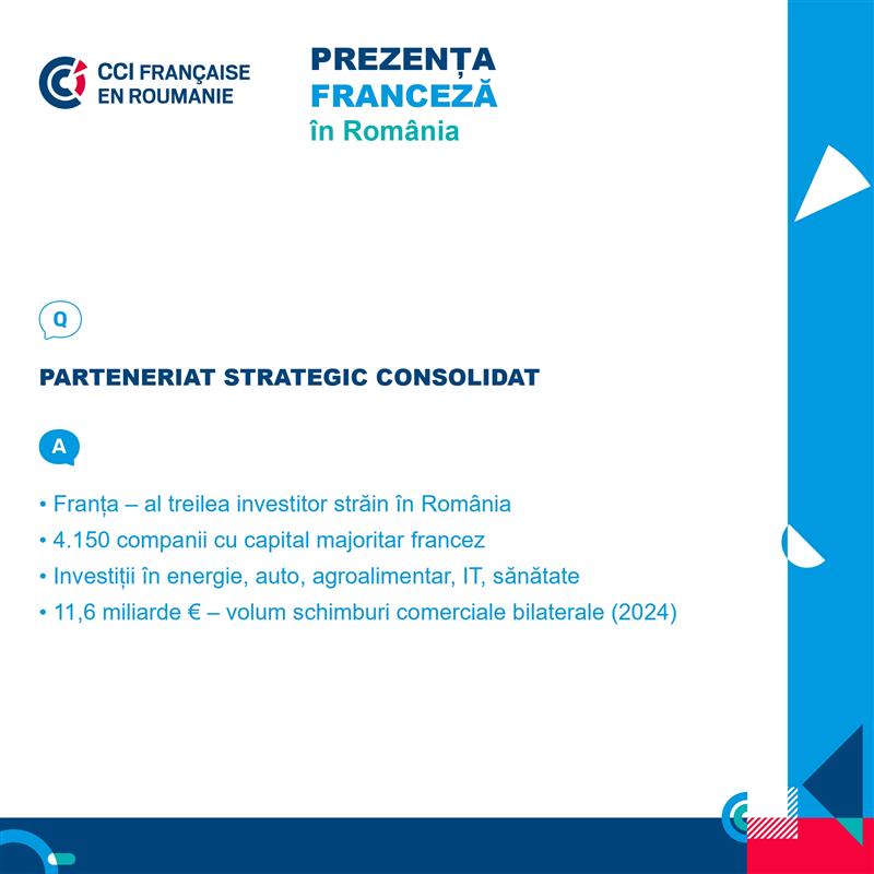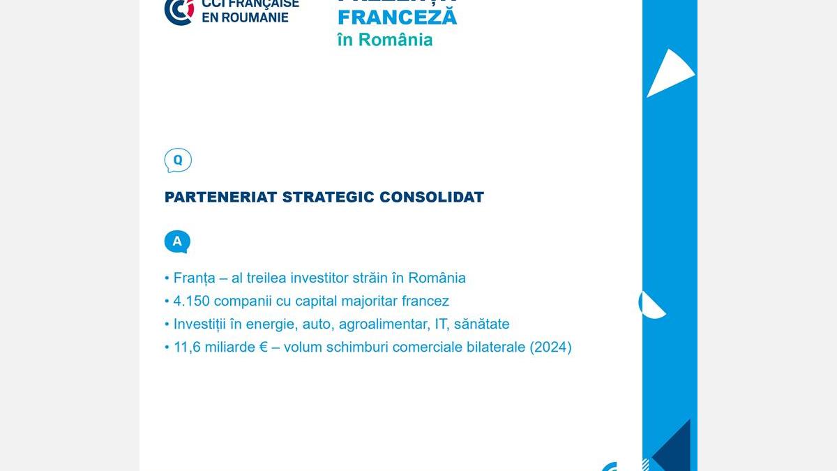 - Franța rămâne unul dintre cei mai importanți parteneri economici ai României, cu o prezență consolidată în ultimele trei decenii, contribuind activ la transformarea structurală a economiei și la dezvoltarea comunităților locale.