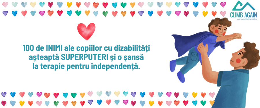 Avem nevoie de tine să ne dai SUPERPUTERI! Printr-o donație poți ajuta 100 de copii cu dizabilități să beneficieze de ședințe de terapie prin escaladă.