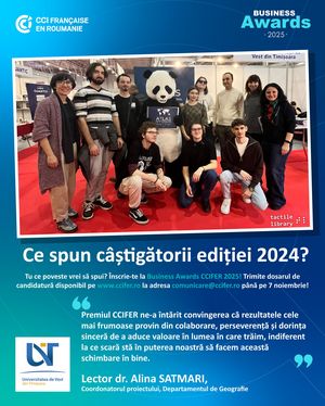 Participarea la competiția Business Awards CCIFER 2024 a oferit echipei TactileLibrary® @UVT oportunitatea de a face cunoscut un proiect la care s-a muncit aproape 2 ani, Atlasul Geografic General Tactil. Ne-am bucurat să aflăm că suntem câștigătorii unuia dintre cele 5 premii pentru inovare, o distincție care confirmă profesionalismul și implicarea tuturor celor care au lucrat la acest proiect. Este o mândrie pentru noi să amintim de fiecare dată că majoritatea membrilor acestei echipe sunt studenți ai Universității de Vest din Timișoara.