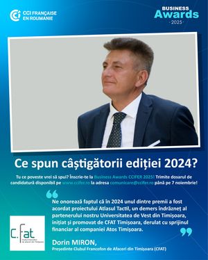 În numele Clubului Francofon de Afaceri din Timișoara (CFAT), doresc să felicit echipa CCIFER pentru inițiativele valoroase promovate în cadrul Business Awards. Ne onorează faptul că în 2024 unul dintre premii a fost acordat proiectului Atlasul Tactil, un demers îndrăzneț inițiat și promovat de CFAT Timișoara.