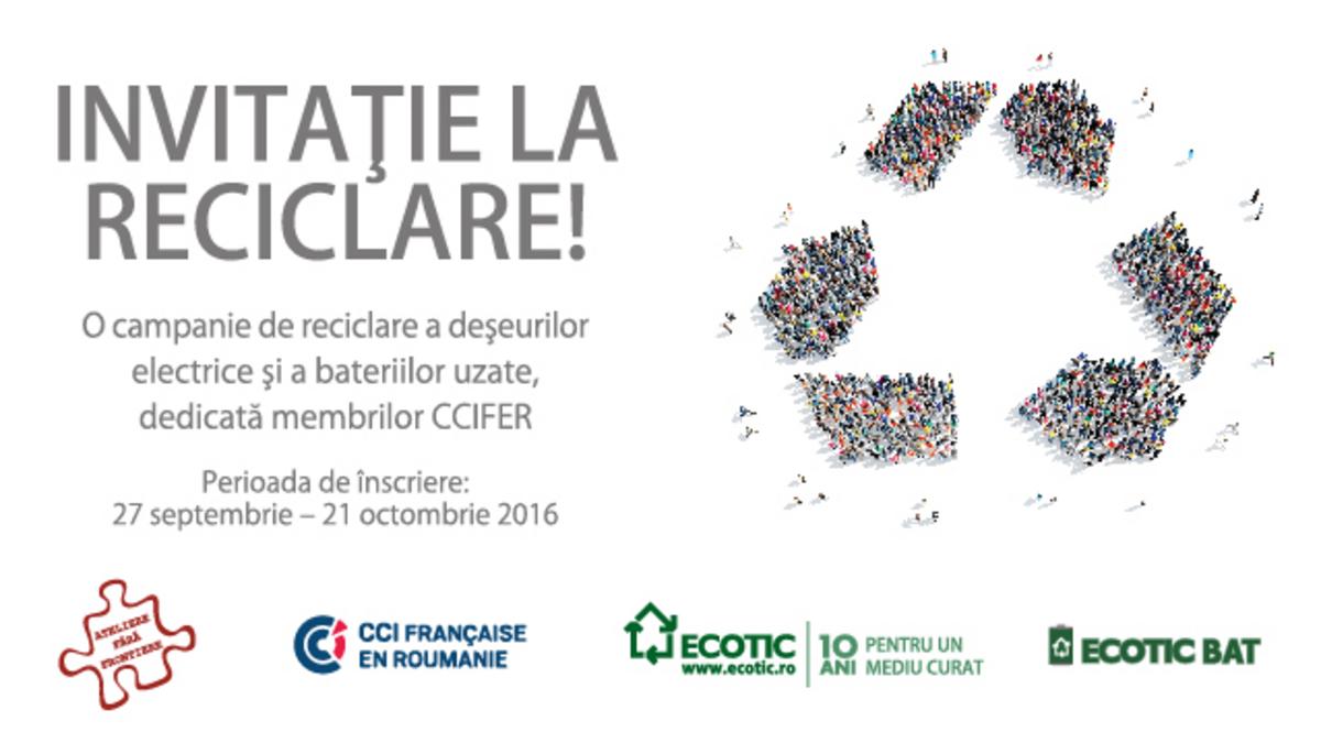 Campania-concurs „Invitatie la Reciclare” este rezultatul parteneriatului dintre Organizatia ECOTIC, Ateliere Fara Frontiere si CCIFER, in contextul in care exista nevoia reala de informare a publicului asupra necesitatii colectarii si reciclarii in Romania. Campania este adresata membrilor CCIFER, iar colectarea deseurilor electrice si electronice si a bateriilor si acumulatorilor uzati va fi facuta de Ateliere Fara Frontiere.