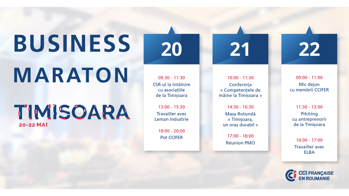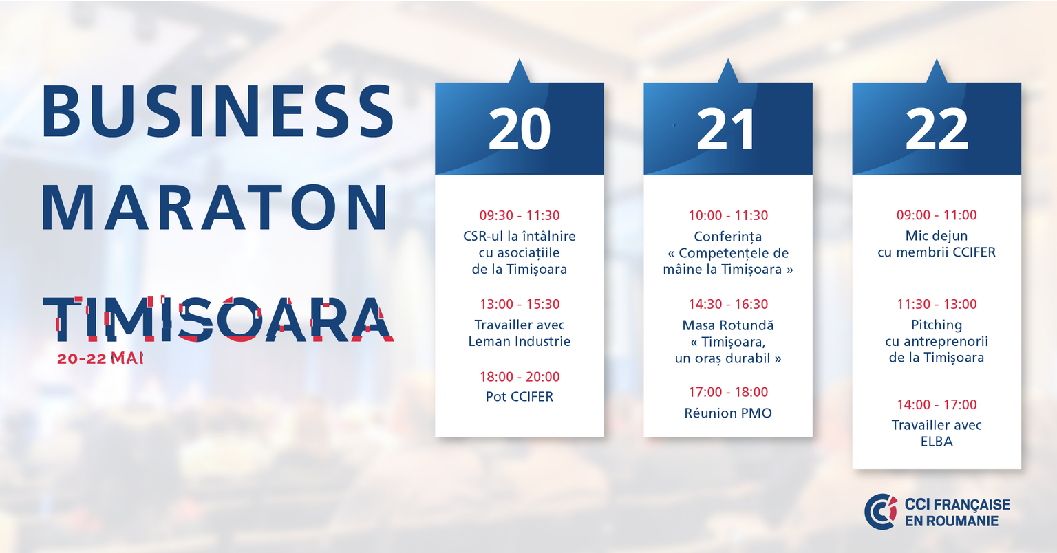 În perioada 20-22 mai 2019, Camera Franceza de Comert si Industrie din Romania (CCIFER) alaturi de Centrul de Afaceri Franco-Roman din Timisoara, precum si de partenerii sai institutionali si strategici organizează o serie de evenimente reunite în cadrul Maratonului de Business de la Timisoara.