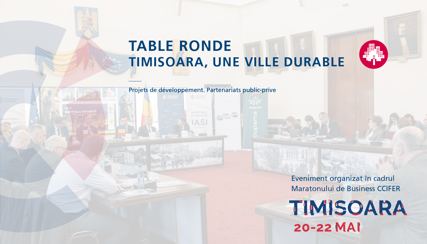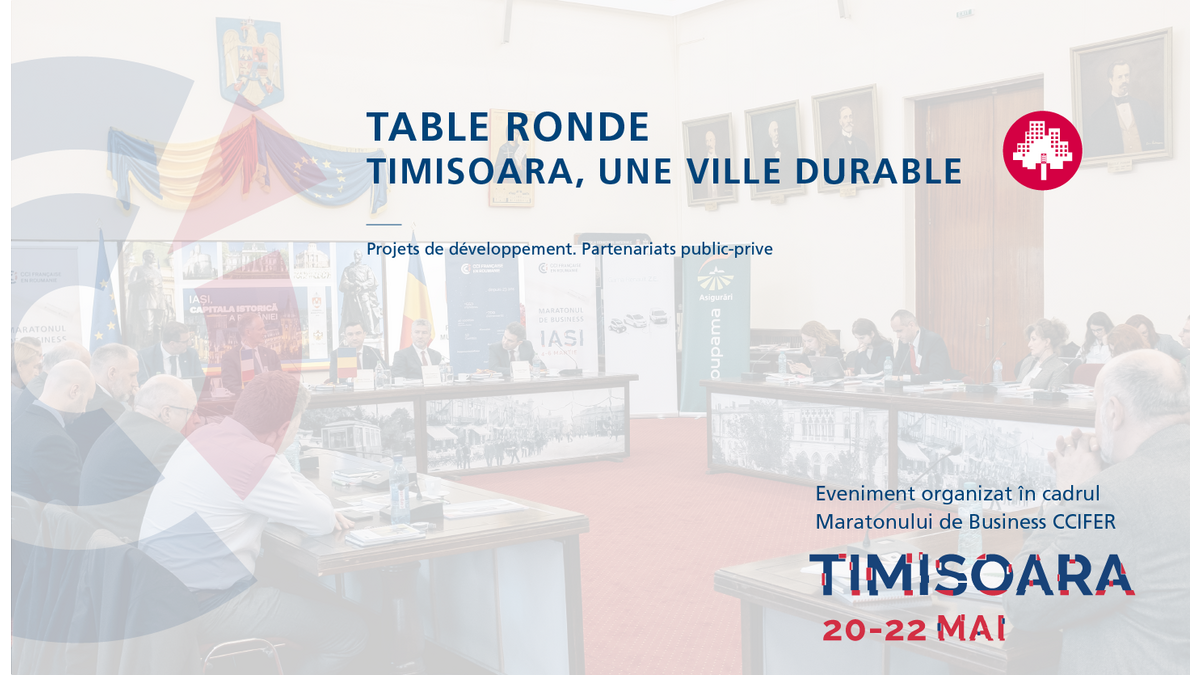 Cameră Franceză de Comerț, Industrie și Agricultura în România (CCIFER) și Centrul de Afaceri Franco-Român din Timișoara, în parteneriat cu Primăria Municipiului Timișoara, organizează în data de 21 mai 2019 masa rotundă ”Timișoara - un oraș durabil”, în prezența domnului primar al Municipiului Timișoara, Nicolae ROBU. Acest eveniment propune un concept integrat de sensibilizare și schimb de bune practici între companii și autorităti, pentru a le permite diferiților actori implicați să-și reevalueze opțiunile, să-și identifice parteneri și să conceapă noi soluții adecvate mobilitătii în viitor.