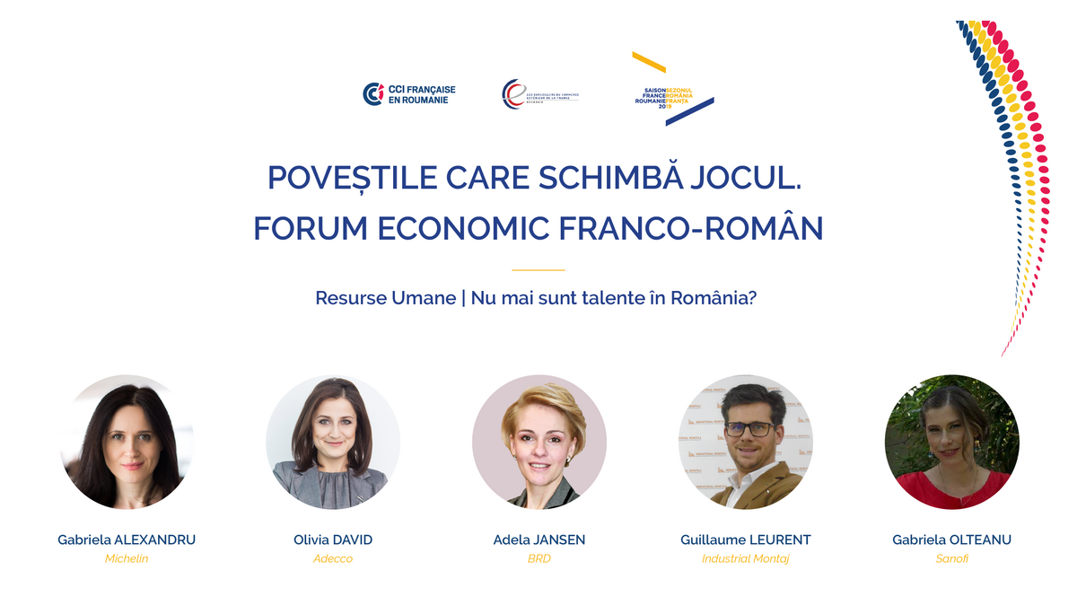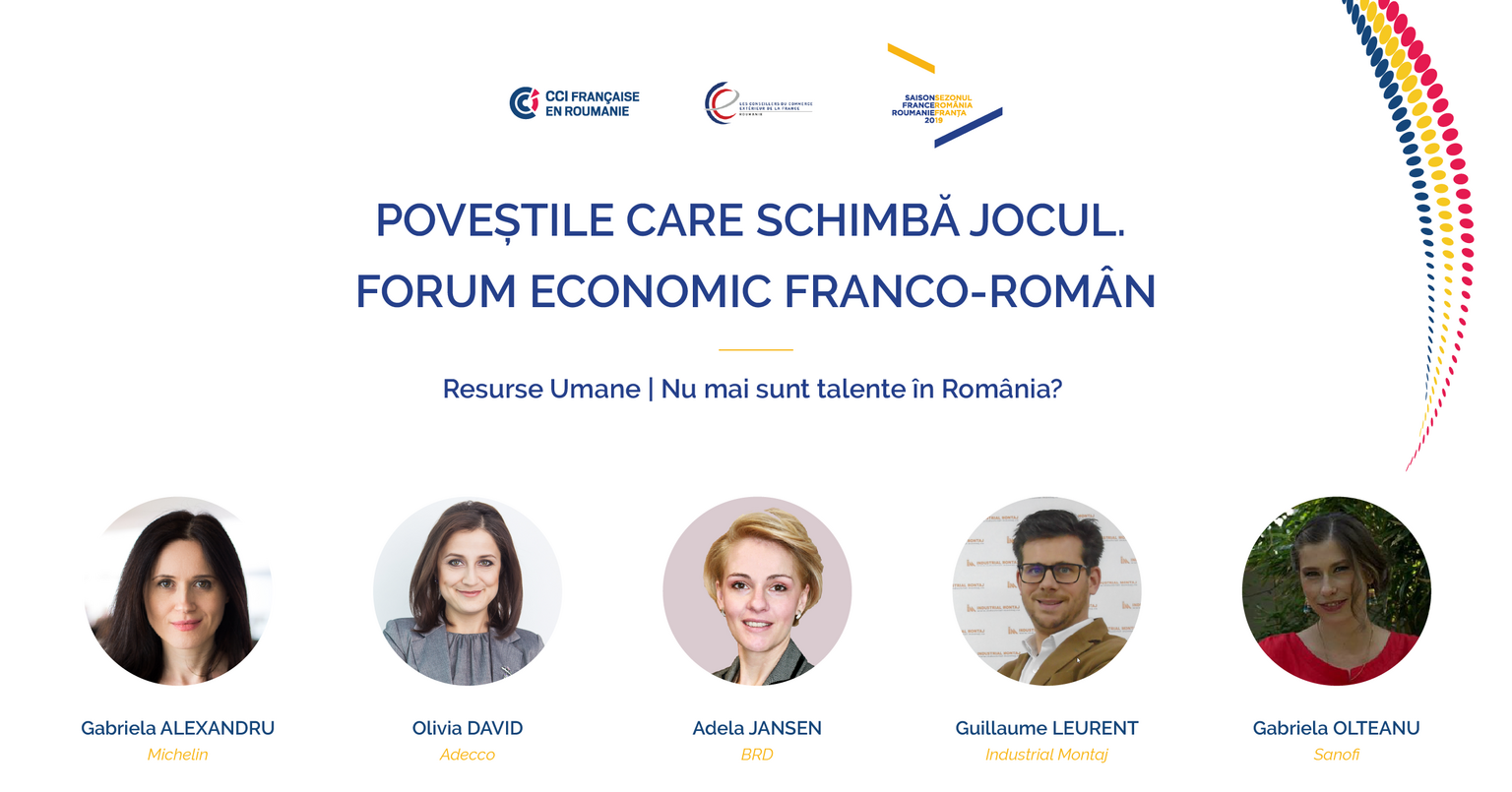 Adela JANSEN, Director Resurse Umane BRD, Gabriela OLTEANU, HR Business Partner Sanofi, Gabriela ALEXANDRU, Director HR Europa Centrală Michelin, Olivia DAVID, Hub Manager ADECCO, și Guillaume LEURENT, Deputy CEO Industrial Montaj vor discuta despre tendințele și perspectivele din domeniul Resurselor Umane, despre motivarea și menținerea talentelor, într-o sesiune din cadrul Forumului Economic „Poveștile care schimbă jocul”, organizat pe 19 iunie, la București (JW Marriott Bucharest Grand Hotel), de Camera Franceză de Comerț și Industrie din România (CCIFER).